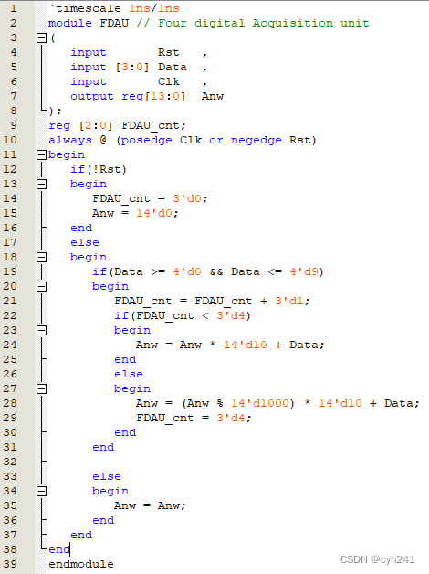 内置5KHZ分频模块,以及延迟5ms消抖模块,使用状态机进行扫描键盘,当首先拉高四行电平,通过状态检测,直到发现有一行电平被拉低,进入消抖模块,延时5ms后仍为低电平则输出高电平Key_State表示按键按下,同时检测列电平,找到按下的按键通过Key_Value输出到FDAU四位数运算模块。因需要使用硬件输入,未进行仿真波形,具体在硬件显示体现。
