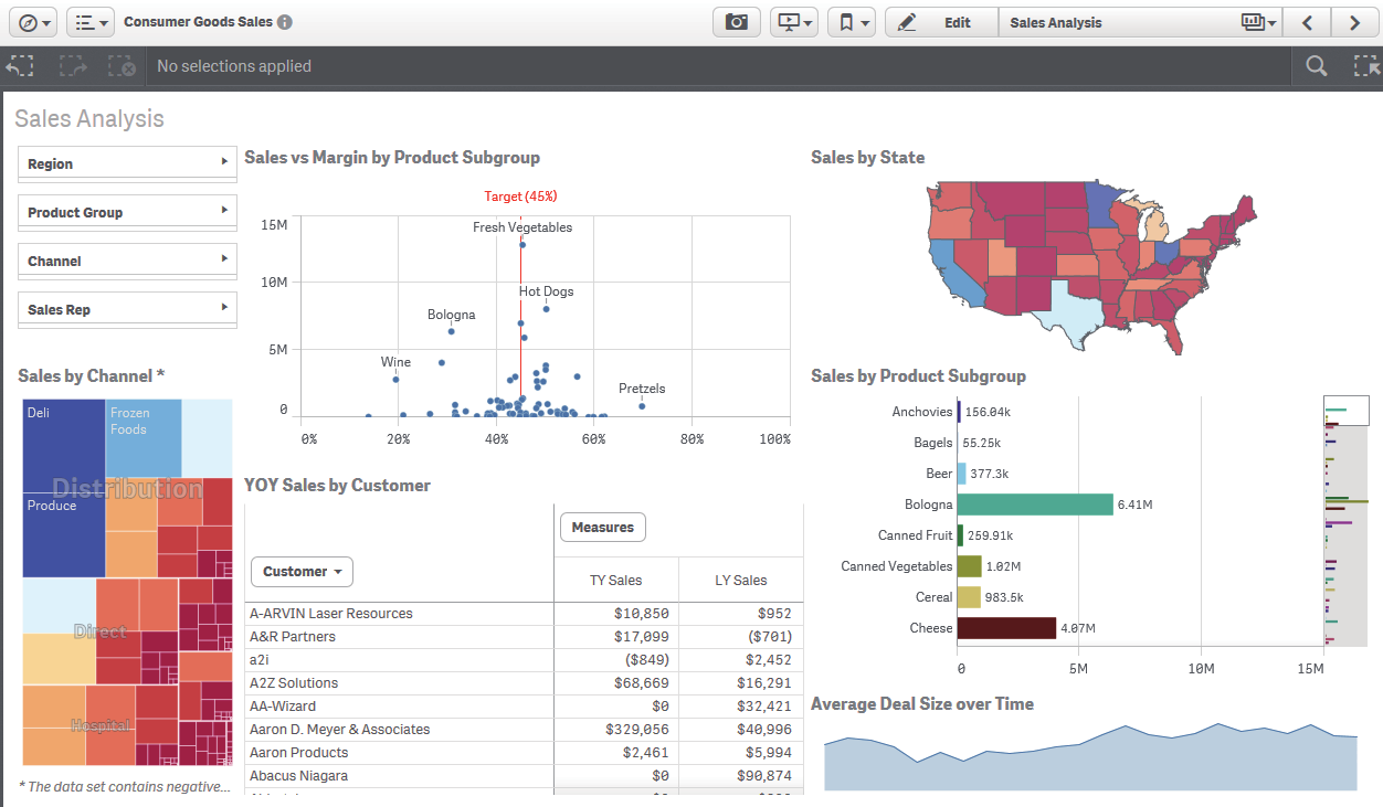 除了以上,Qlik还有很多其他的优点,特别是它主打的关联模型功能,允许用户跨所有数据源探测其数据中可能存在的所有关联。拥有任何技能水平的用户均可自由探索,使用简单的选择和搜索工具,不存在任何限制条件或边界。Qlik Sense的用户不受预定义的层级结构或预先确定的数据关联方法的限制,而是能够自己去探索和理解真正的数据关联方式,这是有别于基于查询的可视化工具的。