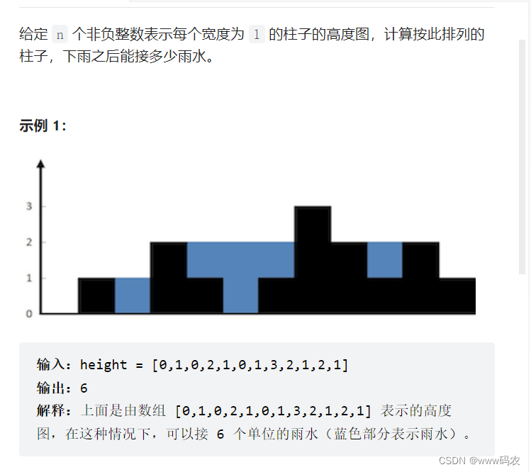 那么如何计算列高度呢 ? 我们就是左侧最高柱子和右侧最高柱子之间最小的柱子高度减去当前所在的高度 就是承接雨水的高度 max(left,right)-height[i];
