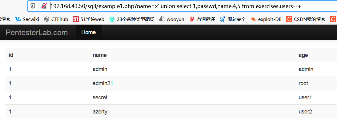 union select 1,column_name,3,4,5 from information_schema.columns where table_schema='exercises' and table_name='users'--+查看users表中列名: