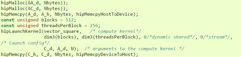 HIP API包括hipMalloc、hipMemcpy和hipFree等函数。熟悉CUDA的程序员也能够快速学习并开始使用HIP API编写代码。通过hipLaunchKernel的宏调用启动计算内核。下面给出了一个最简单的HIP编程的例子。