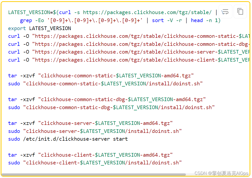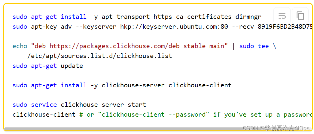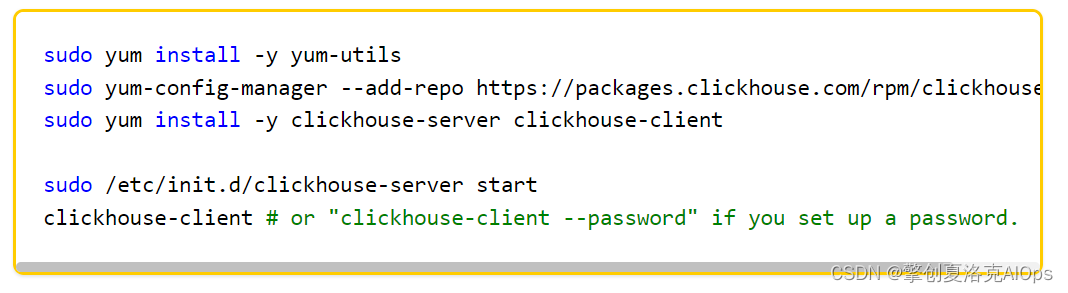 细心的朋友肯定都发现了,官网提供的安装方式,无一例外地都需要`sudo`权限,也就是说,普通用户必须提升到`root`权限才可以正常将`ClickHouse`安装成功。