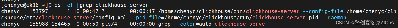 在部署之前,我们将`/home/chenyc/clickhouse`目录提前创建好,其余的选项与`rpm`部署一致,直接在`ckman`上填写就行了,整个部署过程一分钟不到,部署完成后,可以在后台看到`clickhouse`进程,注意它的启动用户是`chenyc`,而不是默认的`clickhouse`用户。