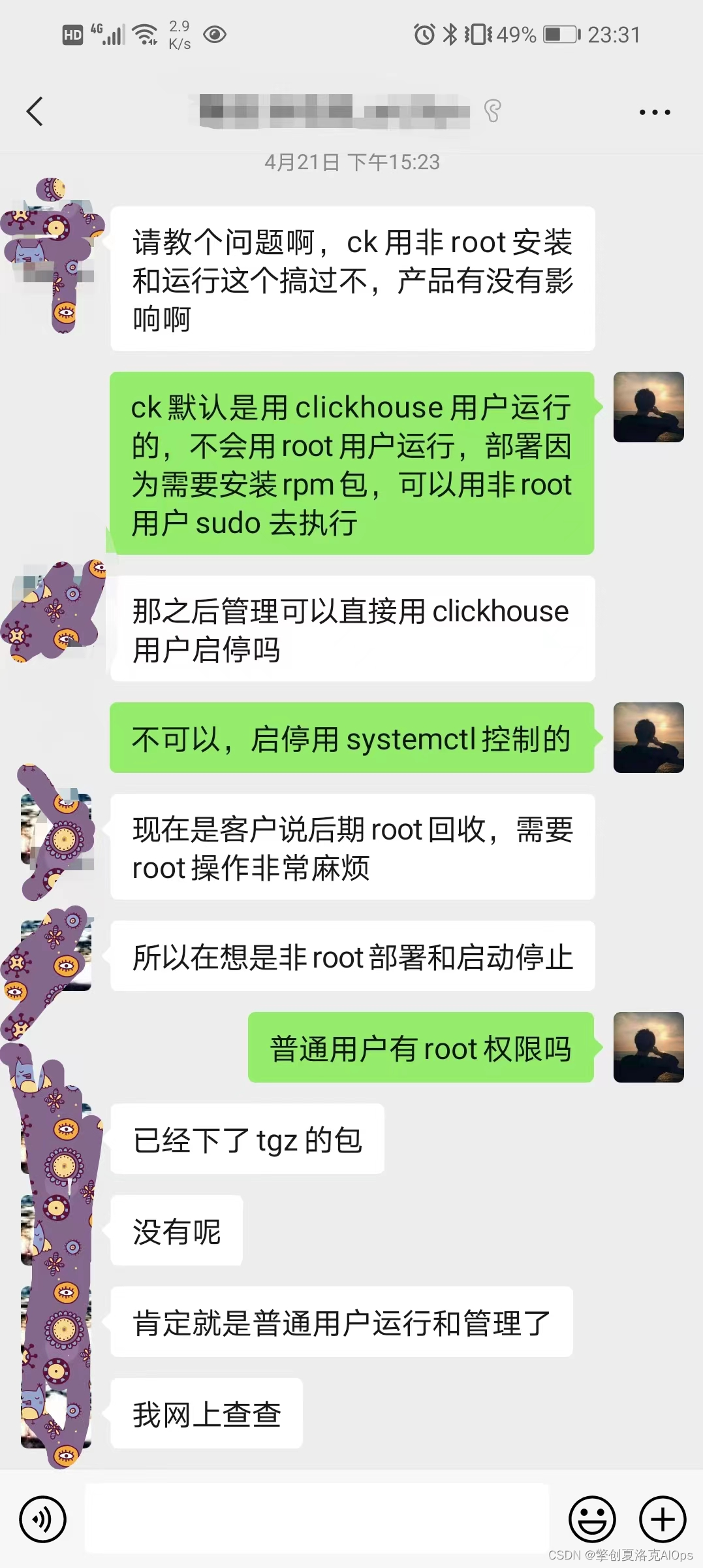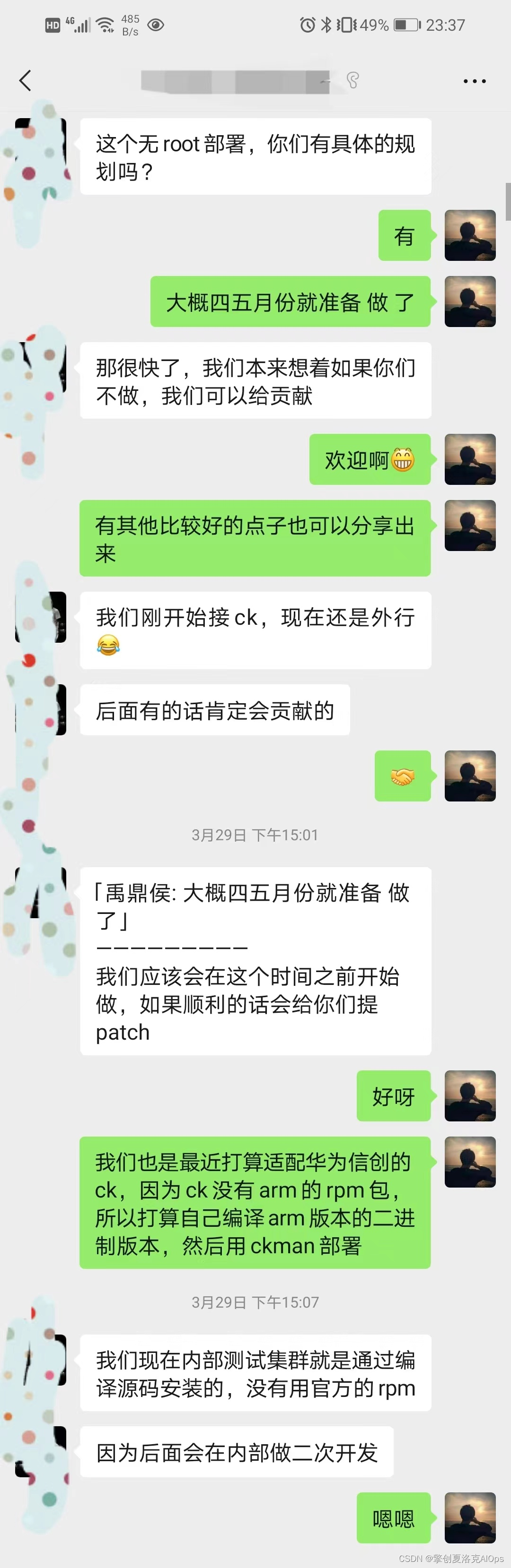 还有些可能是本身就不打算用`rpm`包去部署,而是依赖自己编译二进制可执行文件,这时候如何去部署?可能无`root`也才是更好的方案。比如我与这位`ckman`社区里某米公司的我不愿意透露他姓名的赵姓某某的聊天记录: