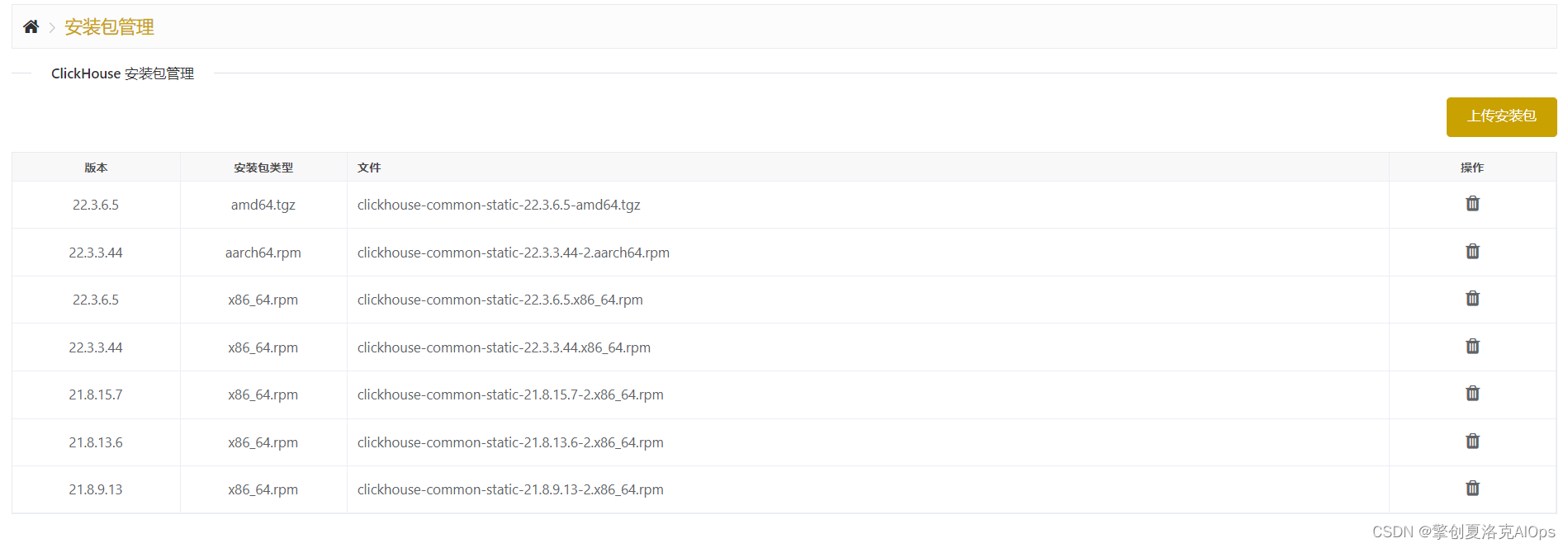 要完成整个操作,首先要向`ckman`上传一个tgz格式的安装包。在`ckman v2.2.5`的版本中,我们重构了安装包管理页面 ,按照不同的安装包类型做了分类,具体效果如图所示:
