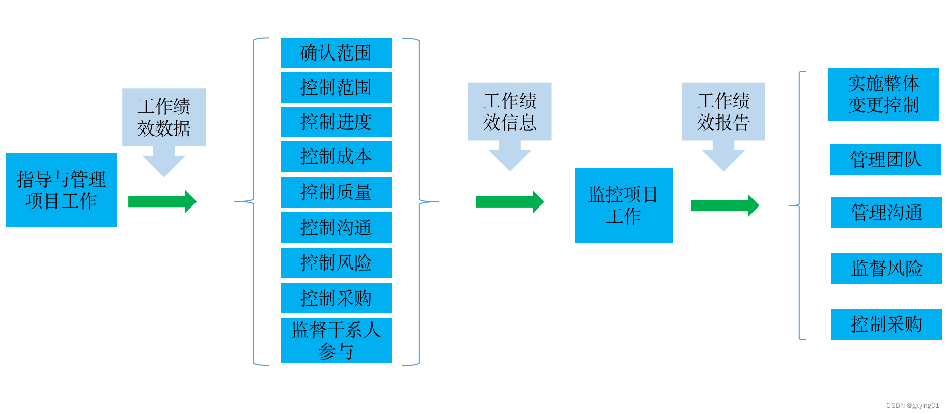 监控项目工作是跟踪、审查和报告整体项目进展,以实现项目管理计划中确定的绩效目标的过程。