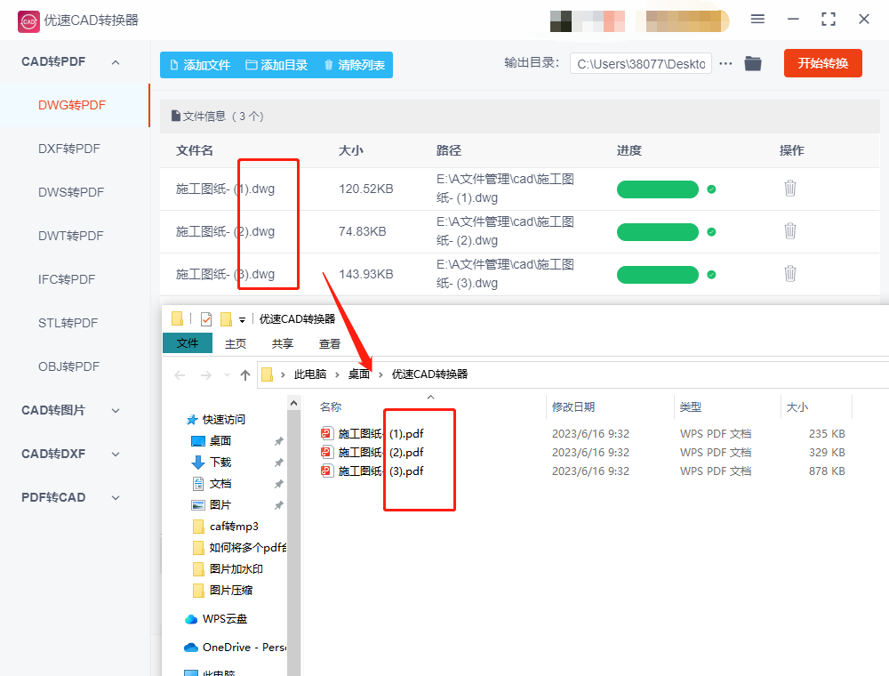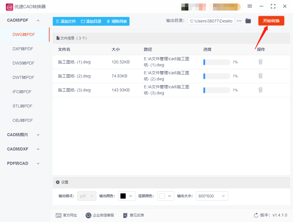 第4步,在完成上述设置后,我们可以点击右上角的“开始转换”按钮,开始将CAD文件转换为PDF文件。当转换完成后,软件会自动弹出输出文件夹,方便用户查看转换完成的PDF文件。
