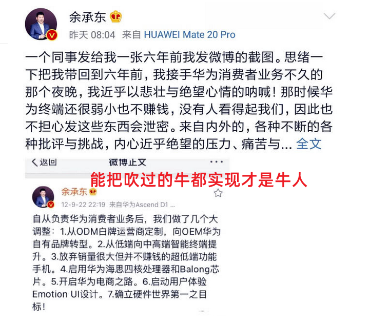 那个时候华为决定从OEM转向自主研发、自主品牌的手机,为了快速打开知名度,余承东经常在新产品发布会和每天采访时爆出惊人之语,“遥遥领先”“超越苹果”“全球第一”等等话语都是家常便饭,特别像身边“但凡有几颗花生米,都不会醉成这样”的中年大叔。所以很多人把余承东的话当成笑话来听,圈内人顺便给了余承东“余大嘴”的外号。