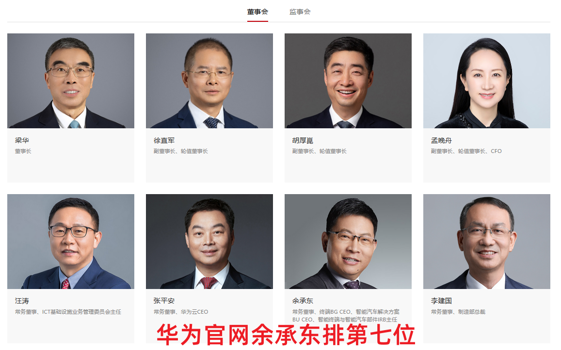 毫无疑问,余承东是华为公司如假包换的高管。根据华为公司官网的“管理层信息”栏目,余承东先生的正式职务是:常务董事、终端BG CEO、智能汽车解决方案BU CEO、智能终端与智能汽车部件IRB主任。