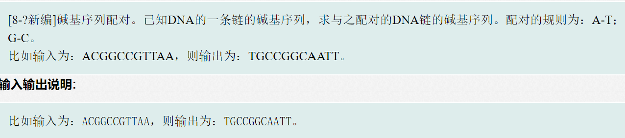 {char one[LEN],the_other[LEN]; //one用于存储原串;the_other用于存储匹配串int i,j;gets(one);i=0, j=0;while(one[i]!='\0'){//startif(one[i]=='A')the_other[j]='T';if(one[i]=='T')the_other[j]='A';if(one[i]=='C')the_other[j]='G';if(one[i]=='G')the_other[j]='C';i++;j++;//end}the_other[j] = '\0';puts(the_other);return 0;