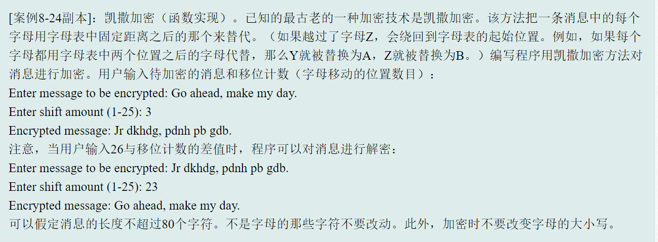 int i;for(i=0;message[i]!='\0';i++){if(message[i]>='a'&&message[i]<='z')message[i]=(message[i]+shift-'a')%26+'a'; //对于'a'先减后加if(message[i]>='A'&&message[i]<='Z')message[i]=(message[i]+shift-'A')%26+'A';}