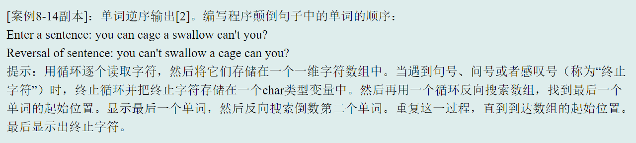 {char a[100], ch;int i = 0, word = 0, f = 1;printf("Enter a sentence: ");i = 0;while (1)//逐个输入{a[i] = getchar();//把输入的第一个字符放到a[i]里if (a[i] == '?' || a[i] == '!' || a[i] == '.')//句末符号,退出判断并记录{ch = a[i];break;}if (a[i] != ' ' && f == 1)//统计单词数(f=1为“计数器可用”,在开始写入单词后立马f=0,表示目前在写的单词已经计数了,计数器不可用){word++;f = 0;}if (a[i] == ' ' && f == 0)//一个单词输入完成(让f=1,表示计数器可用,可以开始下一个单词输入)f = 1;i++;}ch = a[i];a[i] = '\0';printf("Reversal of sentence: ");/*以下为输出部分*/f = 0;//因为最后一个字符非字母,所以f=0不能输出while (i != -1){if (a[i] == ' ' || a[i] == '\0'){a[i] = '\0';//这里从后往前把单词单独切开if (f == 1)//f=1才能输出{f = 0;if (word > 1)printf("%s ", a + i + 1);elseprintf("%s", a + i + 1);word--;}}else//只要碰到字母,就f=1,表示可以输出{if (f == 0)f = 1;}if (i == 0 && a[i] != '\0')printf("%s", a);i--;}printf("%c\n", ch);//system("pause");return 0;