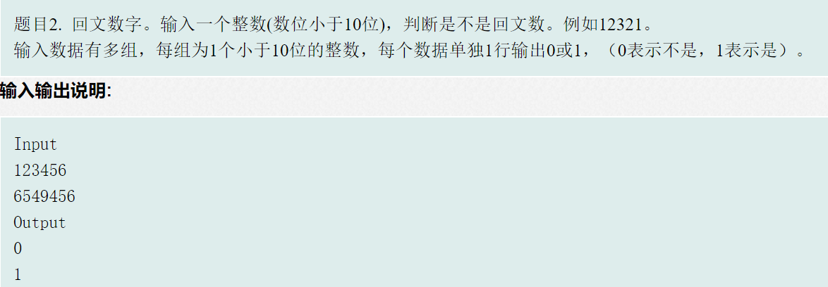 {int x[10],n,i,k;while(scanf("%d",&n)!=-1){ k=0;while(n>0){x[k]=n%10;k++;n=n/10;}for(i=0;i<=(k-1)/2;i++)if(x[i]!=x[k-1-i])break;if(i>(k-1)/2)printf("1\n");elseprintf("0\n");}return 0;