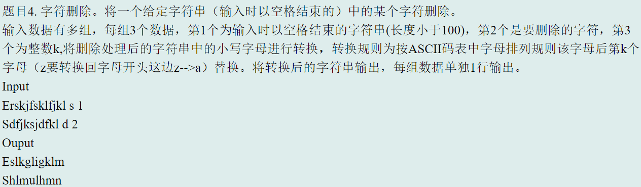 {int i,j;i=0;j=0;while(str[i]!='\0'){if(str[i]!=ch){str[j]=str[i];j++;}i++;}str[j]='\0';for(j=0;str[j]!='\0';j++){if(str[j]>='a'&&str[j]<='z')str[j]=(str[j]-'a'+x)%26+'a';}}