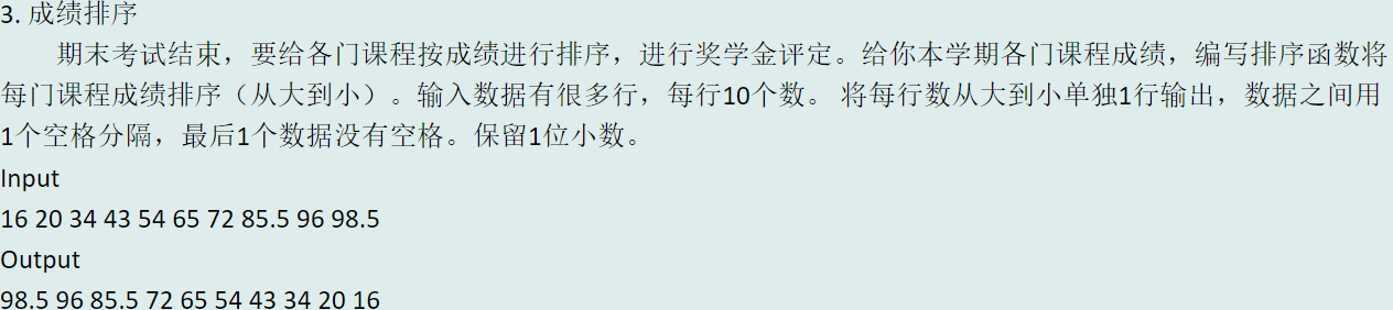 {double data[10];int tmp,i,j,k;while(scanf("%lf",&data[0])!=-1){for(i=1;i<10;i++)scanf("%lf",&data[i]);func_sort(data,10);for(i=0;i<10;i++)printf("%.1lf ",data[i]);printf("\n");}return 0;