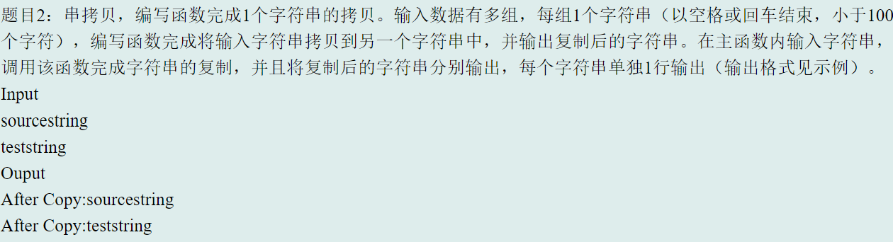 {char str[100],dst[100];while(scanf("%s",str)!=-1){str_copy(str,dst);printf("After Copy:%s\n",dst);}return 0;