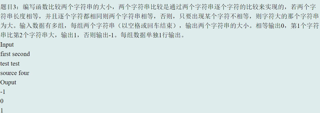 {int m,n,i;m=0;while(a[m]!='\0')m++;n=0;while(a[n]!='\0')n++;i=0; if(m<=n){while(a[i]!='\0'){if(a[i]==b[i])i++;elseif(a[i]>b[i])return 1;elsereturn -1;}return 0;}if(m>n){while(b[i]!='\0'){if(a[i]==b[i])i++;elseif(a[i]>b[i])return 1;elsereturn -1;}return 0;}