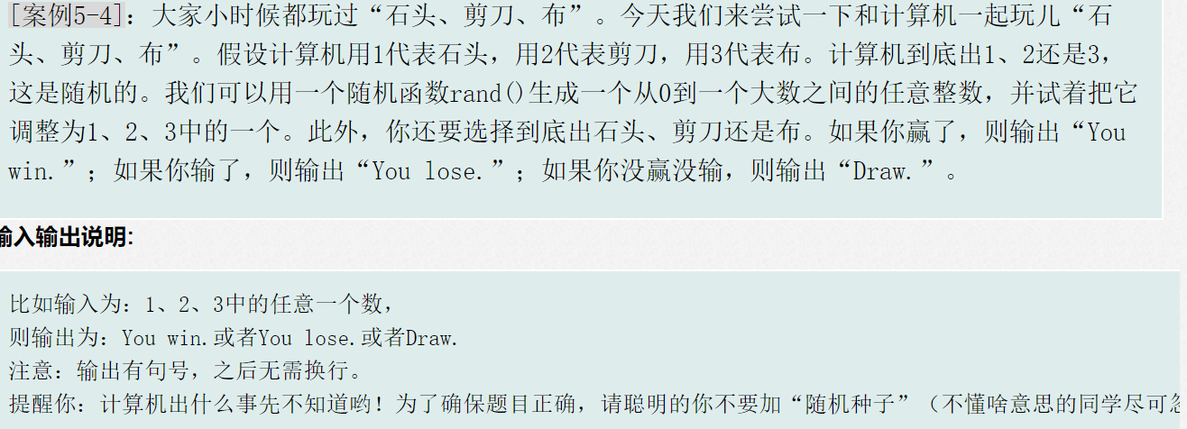 {int computer;int me;scanf("%d",&me);//startcomputer=rand()%3+1;if(computer-me==0)printf("Draw.");if(computer-me==1||me-computer==2)printf("You win.");if(me-computer==1||computer-me==2)printf("You lose.");//endreturn 0;