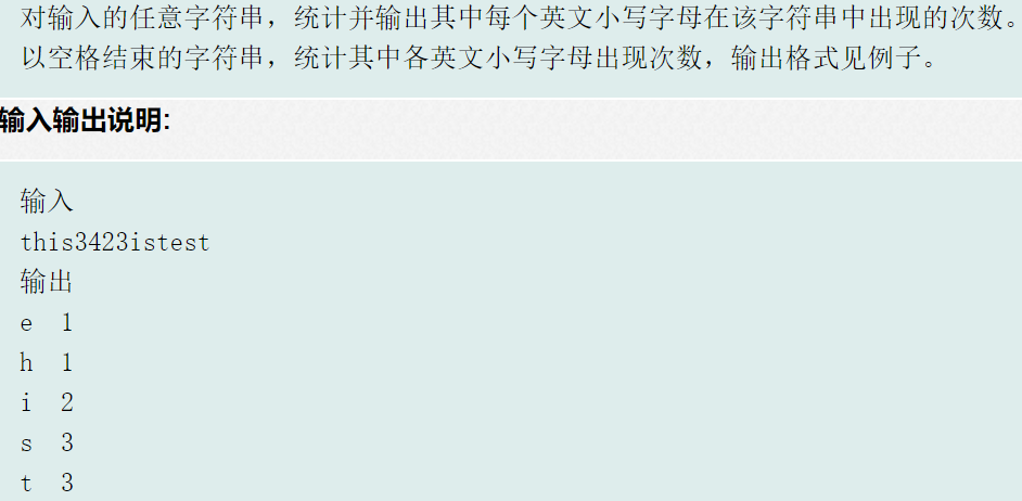 {char str[100];int alp[26] = {0};scanf("%s", str);for (int i = 0; i < strlen(str); i++){if (str[i] >= 'a' && str[i] <= 'z')alp[str[i] - 'a']++;}for (int i = 0; i < 26; i++)if (alp[i] != 0)printf("%c %d\n", i + 'a', alp[i]);return 0;