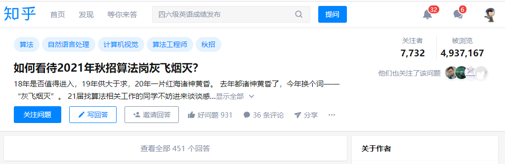 也不知道从啥时候开始,内卷这个词就火起来了。具体到数据和算法等技术岗位方面,内卷可以理解为一年比一年高的入行门槛以及愈发激烈的同行竞争。比如说前段时间知乎上的一个“如何看待2021年秋招算法岗灰飞烟灭?”问题,就引发了将近500万人的围观。