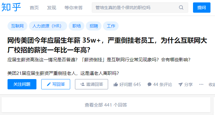 各大互联网企业也不含糊,一年比一年高的校招生倒挂更是直接把这场无期限的内卷推向高潮。且不看今年美团应届生35w+的薪资,已经严重倒挂老员工了。