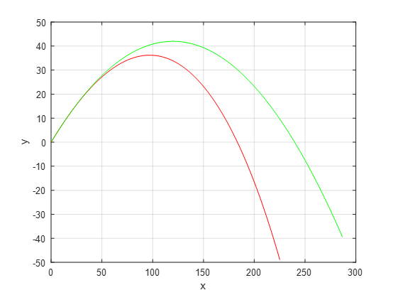 clcclearg=9.8;%重力加速度m=0.145;%重量k=0.05;%空气阻力系数r=0.0366;%半径S=pi*r^2;%阻力面积rou=1.29;%空气密度deltat=0.01;theta=(35/180*pi);%初速度与地面夹角x(1)=0;y(1)=0;%初始位置坐标V(1)=50;%初始速度Vx(1)=V(1)*cos(theta);Vy(1)=V(1)*sin(theta);t=1:700;for n=1:length(t)V(n)=sqrt(Vx(n)^2+Vy(n)^2);%合速度D=rou*k*S.*(V(n).^2);%阻力ax(n)=-(D/m)*Vx(n)/V(n);%水平加速度ay(n)=-g-(D/m)*Vy(n)/V(n);%垂直加速度Vx(n+1)=Vx(n)+ax(n)*deltat;%水平速度Vy(n+1)=Vy(n)+ay(n)*deltat;%垂直速度x(n+1)=x(n)+Vx(n)*deltat+0.5*ax(n)*deltat^2;%水平坐标y(n+1)=y(n)+Vy(n)*deltat+0.5*ay(n)*deltat^2;%垂直坐标px(n)=Vx(1)*n*deltat;%无阻力水平坐标py(n)=Vy(1)*n*deltat-0.5*g*(n*deltat)^2;%无阻力垂直坐标endplot(x,y,'r',px,py,'g');%红的有阻力,绿的无阻力grid onxlabel('x'),ylabel('y');