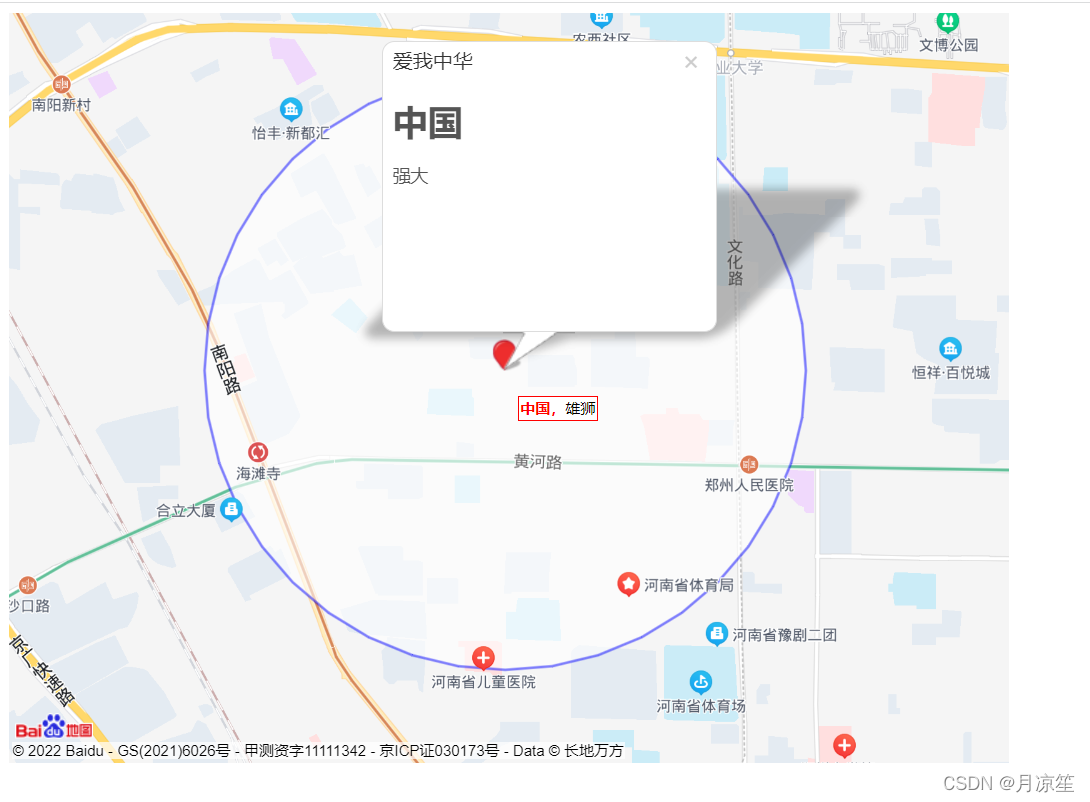 var content = "中国,雄狮!";var label = new BMapGL.Label(content, { // 创建文本标注position: point, // 设置标注的地理位置offset: new BMapGL.Size(10, 20) // 设置标注的偏移量})map.addOverlay(label);