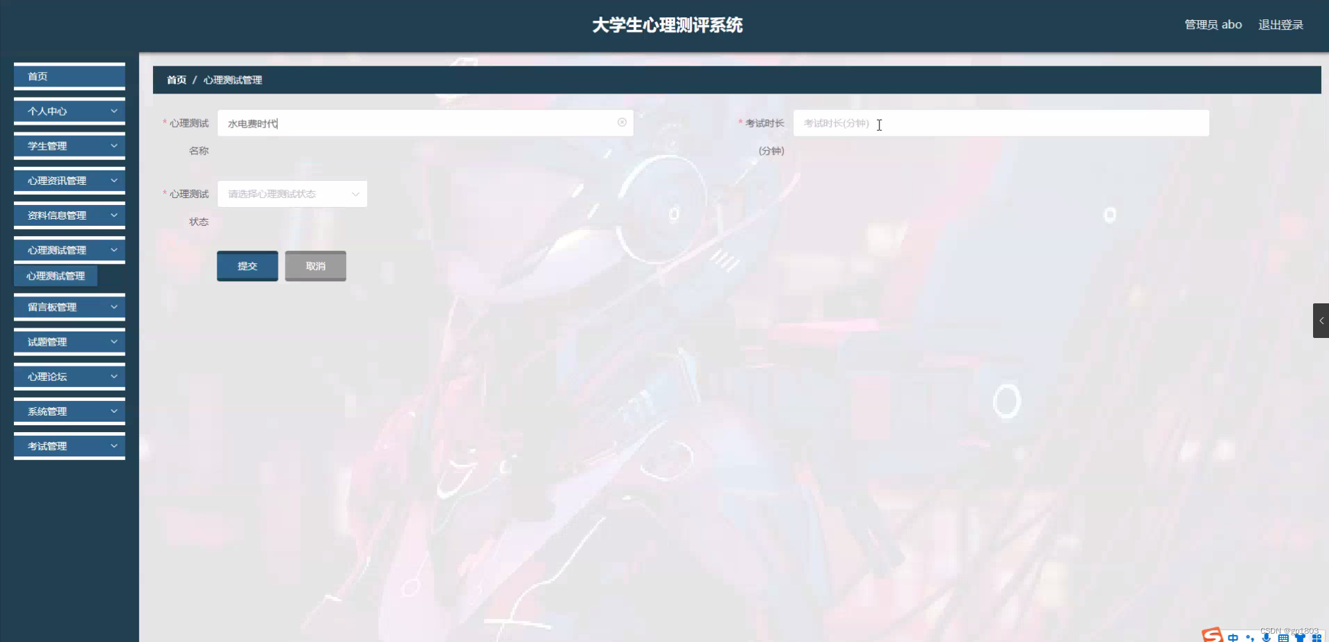 研究背景: 随着社会的发展和人们对心理健康重视程度的提高,大学生心理健康问题日益突出。大学生面临着学业压力、人际关系困扰、职业规划等多方面的挑战,心理问题也逐渐成为影响他们学习和生活的重要因素。因此,开发一种针对大学生的心理测评系统具有重要的现实意义。