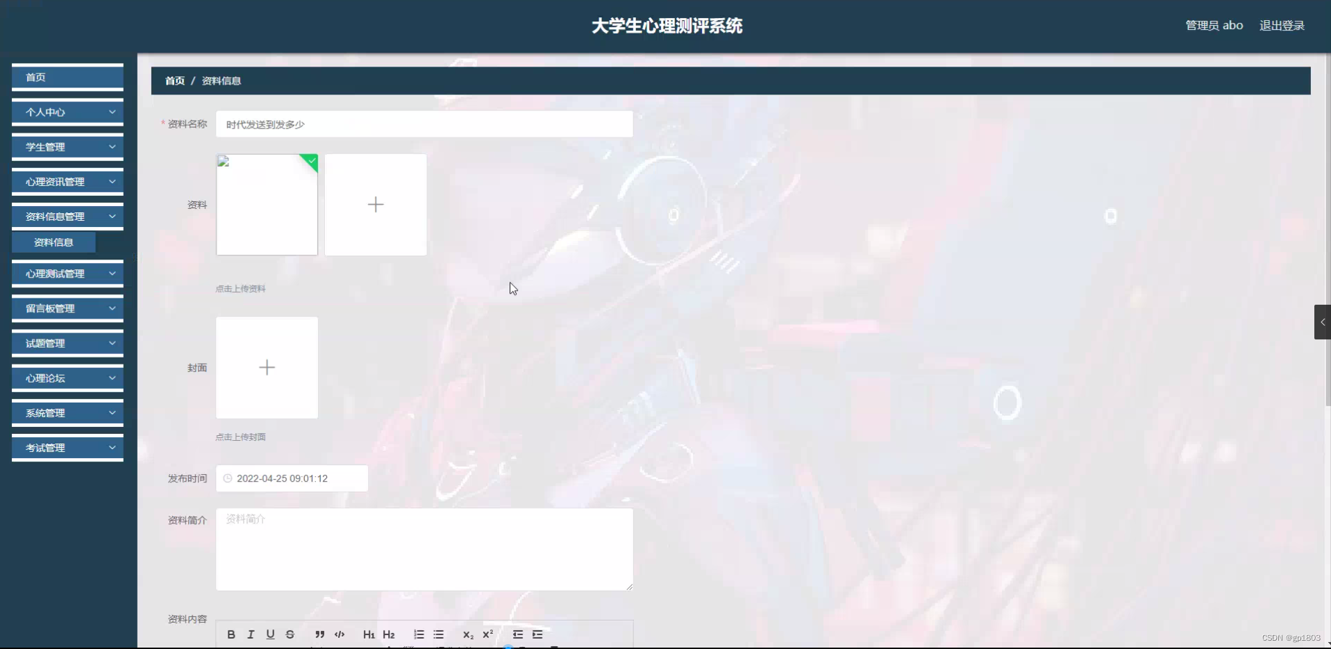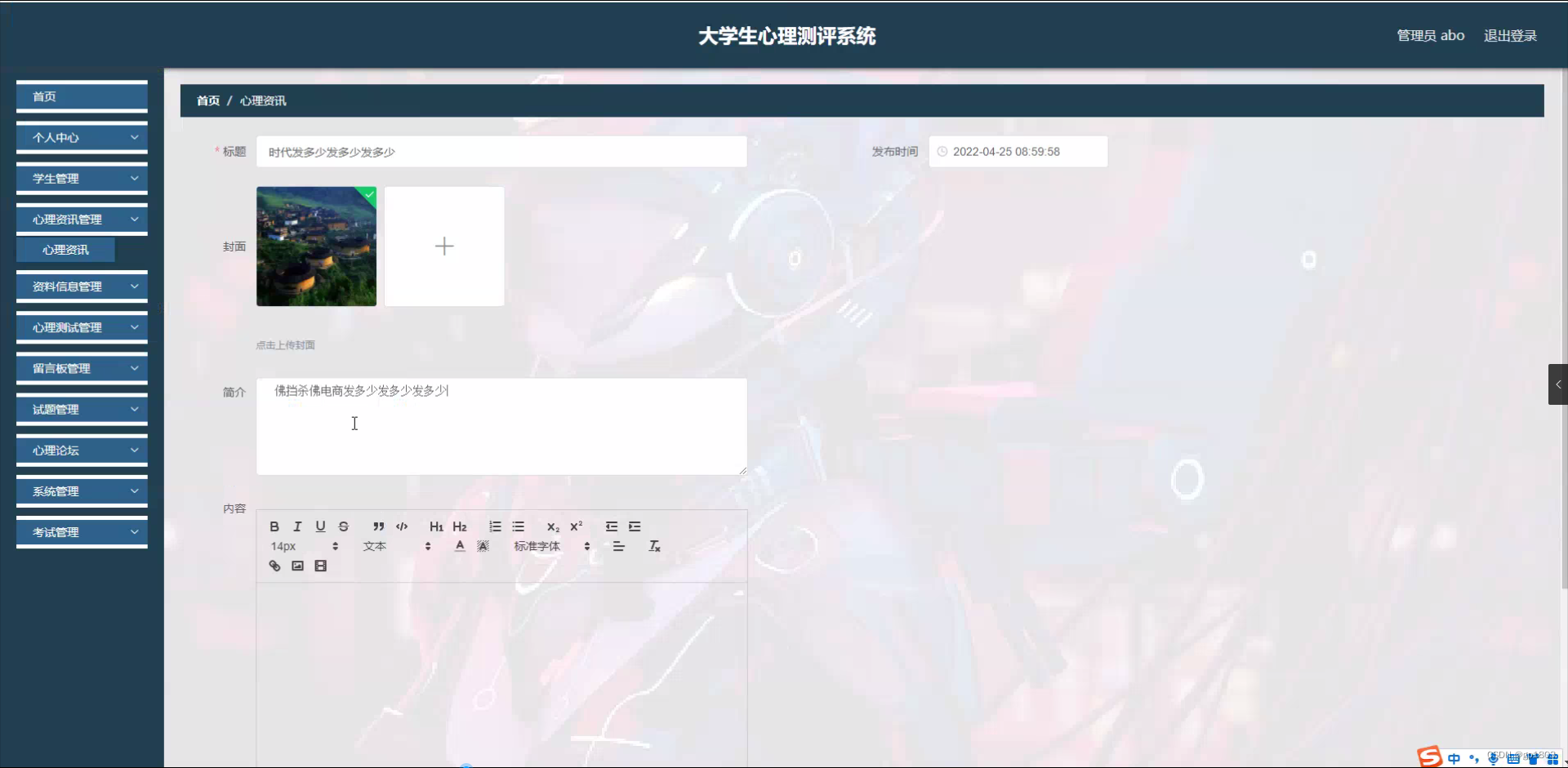 心理资讯功能:搭建心理资讯发布平台,提供专业的心理知识、心理健康指导和心理问题解决方案,帮助大学生获取相关的心理知识和技巧。