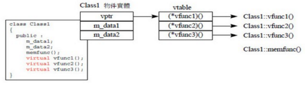 动态多态由虚函数和继承,虚函数主要通过虚函数表(V-Table)实现。如果一个类包含虚函数,那么就会拥有一张虚函数表(在编译器就建立),虚函数表存储的每一项是一个虚函数的入口地址。对象不包含虚函数表,只有隐藏成员--虚指针(在运行期生成,指向虚表,方便在运行期根据对象查询到底执行哪个函数,即动态绑定。虚指针存在于对象实例地址的最前面,保证虚函数表有最高的性能),派生类会生成一个兼容基类的虚函数表。
