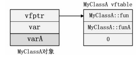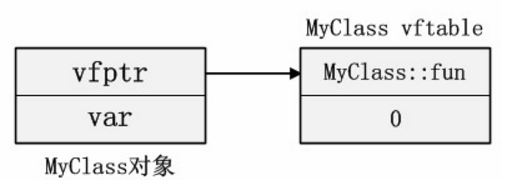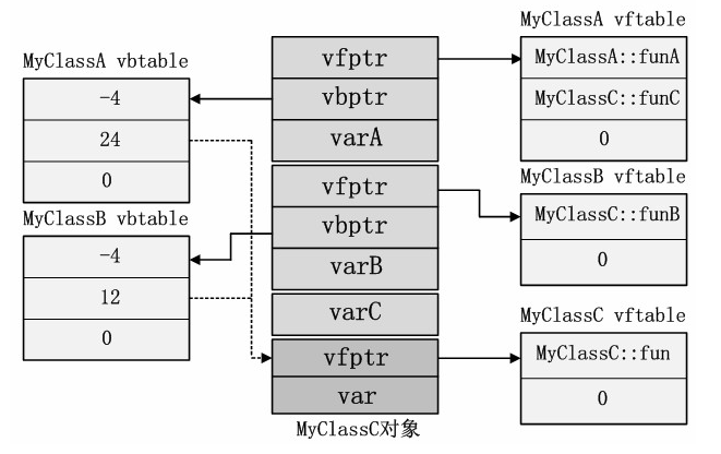 子类对象中包括各基类对象副本,其中每个基类(MyClassA和MyClassB)和公共基类(MyClass)对象有自己的虚函数表指针,每个虚拟继承了MyClass的父类对象还需要记录一个指向虚基类表vbtable的指针vbptr