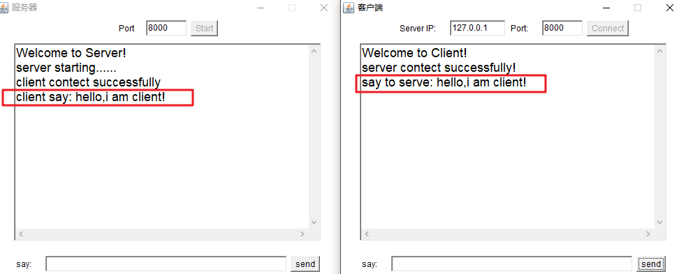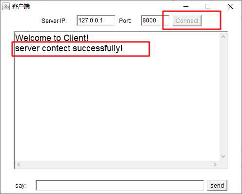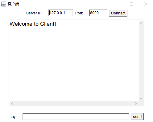 import java.net.*;public class Client {public static void main(String[] args) {ClientMainFrame clientMainFrame = new ClientMainFrame("客户端"); //创建主窗体,标题为“服务器”clientMainFrame.setVisible(true); //设置主窗体可视化}}/*主窗体类*/class ClientMainFrame extends Frame {private final int DEFAULT_WDITH = 500, //窗体默认宽度DEFAULT_HEIGHT = 400; //窗体默认高度private Font font = new Font("name",Font.PLAIN,18); private TextField ipInput = new TextField("127.0.0.1",8), //ip地址输入文本框(默认127.0.0.1)portInput = new TextField("8000",5), //端口号输入文本框(默认8000)userInput = new TextField("",46); //用户输入文本框private TextArea receieveInput = new TextArea("Welcome to Client!",12,42); //聊天记录显示文本域private Panel setPanel = new Panel(), //设置界面(容器)(容器默认FlowLayout)receievePanel = new Panel(), //接收界面(容器)sendPanel = new Panel(); //发送界面(容器)private ConnectButton connectButton = new ConnectButton("Connect");private ClientSendButton clienttSendButton = new ClientSendButton("send");private Socket s = null; //用于接收处理客户端请求返回的套接字private DataOutputStream dos = null; //客户端输出流private DataInputStream dis = null;ReceieveServer receieveServer = null;public ClientMainFrame(String title) { super(title); //调用父类构造方法,生成带标题的窗体addWindowListener(new WindowsClosed()); //添加窗体监听器,用于关闭窗口setBounds(600, 80, DEFAULT_WDITH, DEFAULT_HEIGHT); //设置窗体位置和大小setResizable(false); //设置用户不可调整大小add(setPanel,"North"); //添加设置容器到窗体setPanel.add(new Label("Server IP: "));setPanel.add(ipInput);setPanel.add(new Label("Port: ")); setPanel.add(portInput);setPanel.add(connectButton);add(receievePanel, "Center"); //添加聊天记录显示容器到窗体receieveInput.setFont(font);receievePanel.add(receieveInput, "Center");add(sendPanel, "South"); //添加用户发送容器到窗体sendPanel.add(new Label("say: "));sendPanel.add(userInput);sendPanel.add(clienttSendButton);}/*连接按钮(实现监听器接口)*/class ConnectButton extends Button implements ActionListener{public ConnectButton(String name) {super(name);addActionListener(this); //自身已经实现监听器接口,很重要的代码!!! }public void actionPerformed(ActionEvent e) {try {setEnabled(false);s = new Socket(ipInput.getText(),Integer.valueOf(portInput.getText())); //等待客户端的连接请求receieveInput.append("\nserver contect successfully!"); //连接成功后显示client contect successfullydos = new DataOutputStream(s.getOutputStream());dis = new DataInputStream(s.getInputStream());receieveServer = new ReceieveServer();receieveServer.start();}catch(IOException ioe) {receieveInput.append('\n'+ioe.toString());}finally {}}}/*客户端发送按钮*/class ClientSendButton extends Button implements ActionListener{public ClientSendButton(String name) {super(name);addActionListener(this); //自身已经实现监听器接口,很重要的代码!!! }public void actionPerformed(ActionEvent e) {try {dos.writeUTF(userInput.getText());dos.flush();receieveInput.append('\n'+"say to serve: "+userInput.getText());userInput.setText("");}catch(IOException ioe) {receieveInput.append('\n'+ioe.toString());}}}/*创建一个线程,读取服务器输入*/class ReceieveServer extends Thread{public void run() {try {String str = dis.readUTF();while(str != null){receieveInput.append('\n'+"serve say: "+str); str = dis.readUTF();}}catch(IOException ioe) {receieveInput.append('\n'+ioe.toString());} }}/*继承自Windows监听器,重写关闭窗体的方法*/class WindowsClosed extends WindowAdapter{public void windowClosing(WindowEvent e) {System.exit(-1); //程序终止}}}