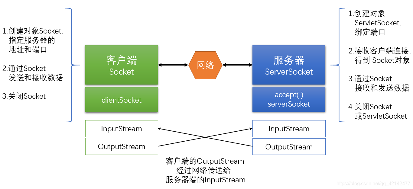 - 建立连接后,利用I/O进行通信,客户端和服务器两个模块中各有一个输入流和输出流,客户端的输出流连接到服务器的输入流,而客户端的输入流连接到服务器的输出流(为了便于传输利用转换流将字符流转换为字节流)。
