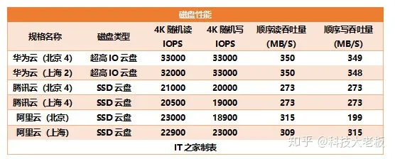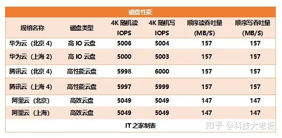 但因为华为云这边有自研的芯片优势(作为ICT厂商,华为在存储市场上是非常领先的,特别是企业级全闪存领域),到了SSD云盘的评测时,华为云的领先优势就比较明显。