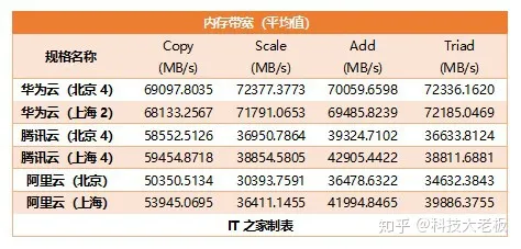 内存带宽上,华为云在Scale、Add以及Triad三项上,内存带宽表现基本上是其他两家的2倍: