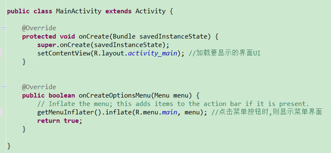 在MainActivity.java里主要创建了一个MainActivity类,继承于Activity,如下图所示: