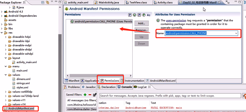 3.3 然后添加打电话申请权限(用于是否支持从应用中直接打电话)