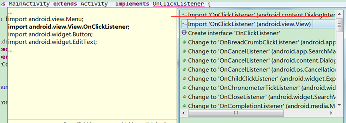 } 注意 导入包点击监听事件的包时,选择第二个"android.view.view" :
