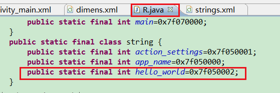 我们可以看到只要是layout_width和layout_height属性的值是写的直接值外,其它的全部用的是索引标记的(@XXX/YYYY),这些索引指针地址都会存在R.java中,而对应的索引内容都会存在values/XXXs.xml中(比如@dimen位于dimens.xml,而string位于strings.xml)