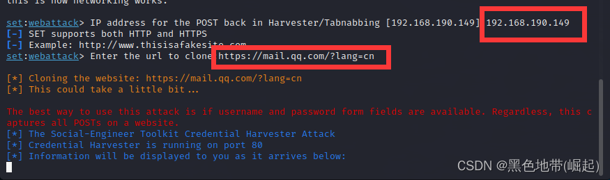 输入本机(攻击机)IP,和克隆的URL(我使用的QQ邮箱的登录页面)