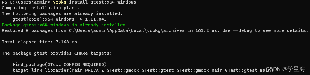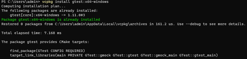 现在利用它来下载 googletest ,打入 vcpkg install gtest:x64-windows 后面的平台可以自己改,如果是 Linux 平台,那么就是 vcpkg install gtest:x64-linux 。如果下载完成了,命令行会出现以下文字。