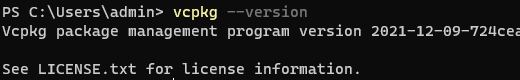 当 vcpkg 正确安装之后,我们在命令行打入 vcpkg --version 时可以看到以下内容。
