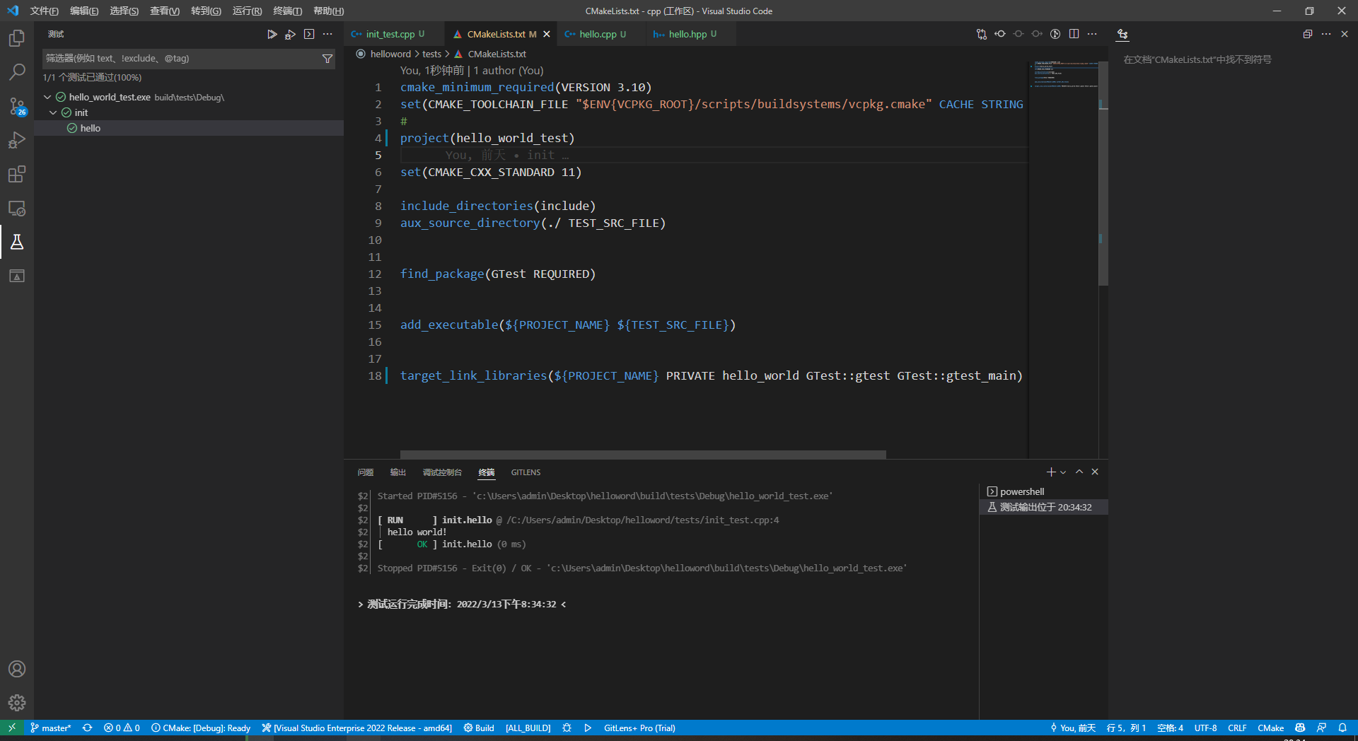 上面讲了 CMakeLists.txt 的配置,下载需要利用 vcpkg 下载 googletest 单元测试框架,不然原本的 CMakeLists.txt 会报错找不到包。
