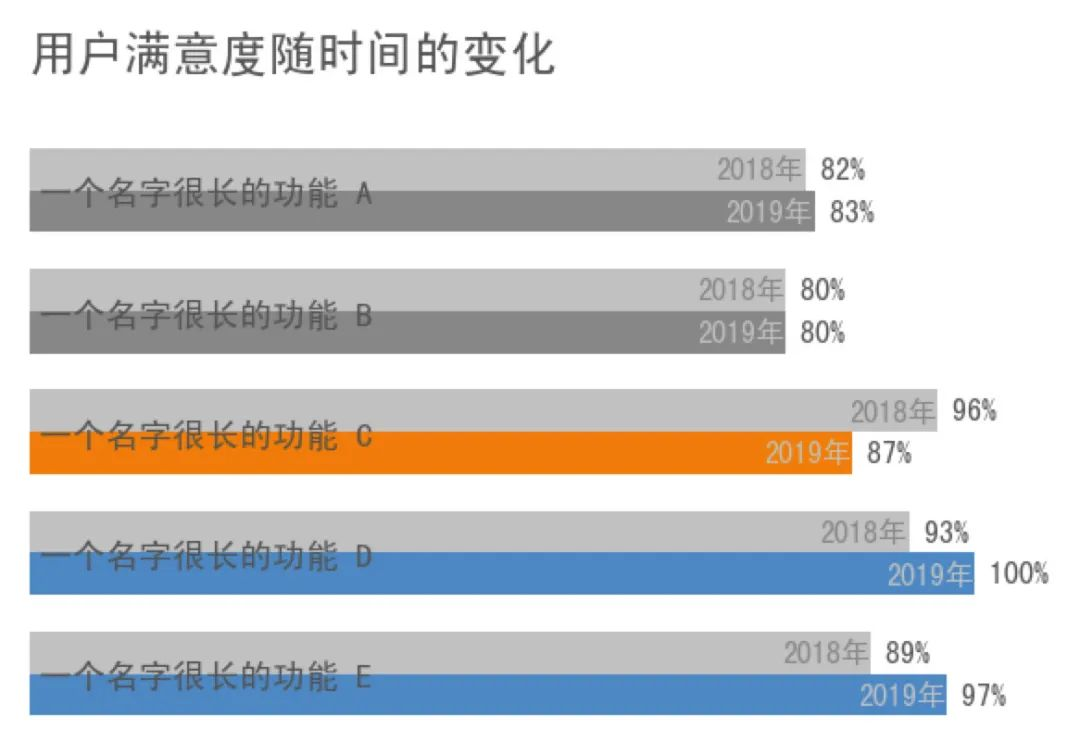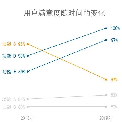 比如说,对于某产品不同功能的用户满意度调查数据,我们可以用哑铃图来进行对比分析,效果图如下: