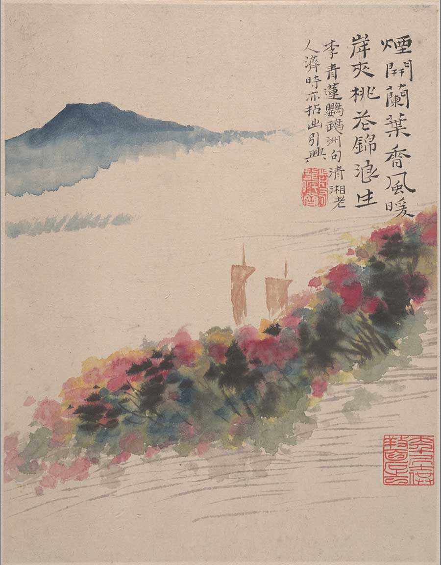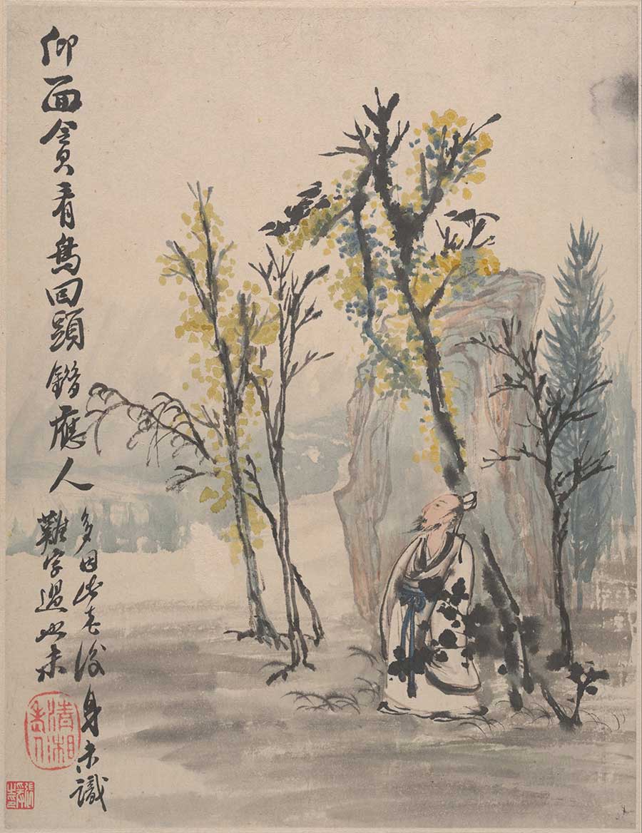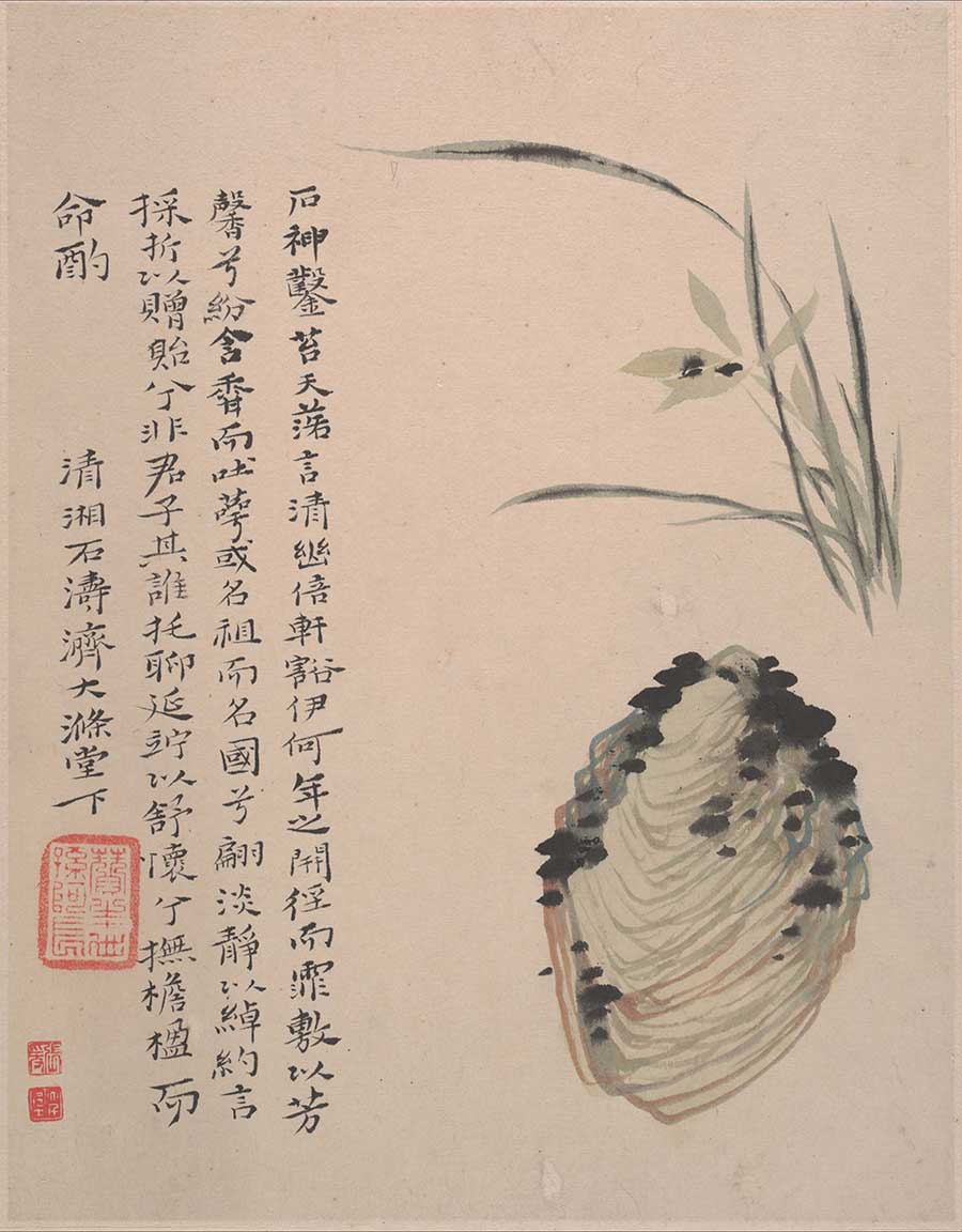 石涛(1642-约1718年),俗姓朱,明宗室靖江王朱赞仪十世孙,谱名若极,广西桂林人。明灭亡后,出家为僧,法名原济,字石涛,号清湘老人、苦瓜和尚等。工于诗文,擅绘山水、兰竹、花草及人物。其笔情纵恣凝炼,独具创新,对扬州画派和近、现代中国画的影响极大。与清初画坛朱耷、髡残、弘仁合称“清四僧”,著有《苦瓜和尚画语录》,针对画坛时弊提出诸多精辟见解。他主张“笔墨当随时代”和“借古以开今”,强调对大自然要有真切的艺术感受,在艺术创作时要“我自用我法”,反对泥古不化。