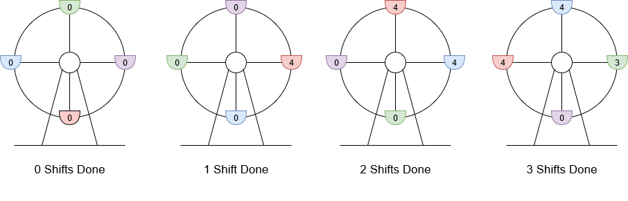 你可以随时停下摩天轮,即便是 在服务所有游客之前 。如果你决定停止运营摩天轮,为了保证所有游客安全着陆,将免费进行所有后续轮转 。注意,如果有超过 4 位游客在等摩天轮,那么只有 4 位游客可以登上摩天轮,其余的需要等待 下一次轮转 。