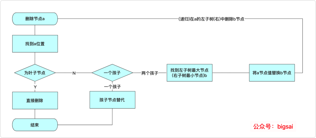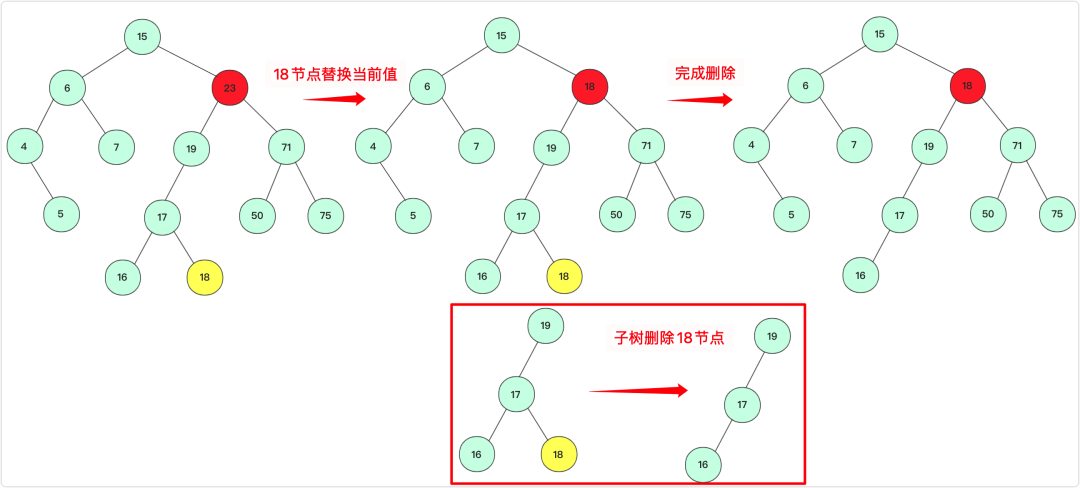 这里演示是选取左子树最大节点(最右侧)替代,当然使用右子树最小节点也能满足在这待删除的大小关系,原理一致。整个删除算法流程为: