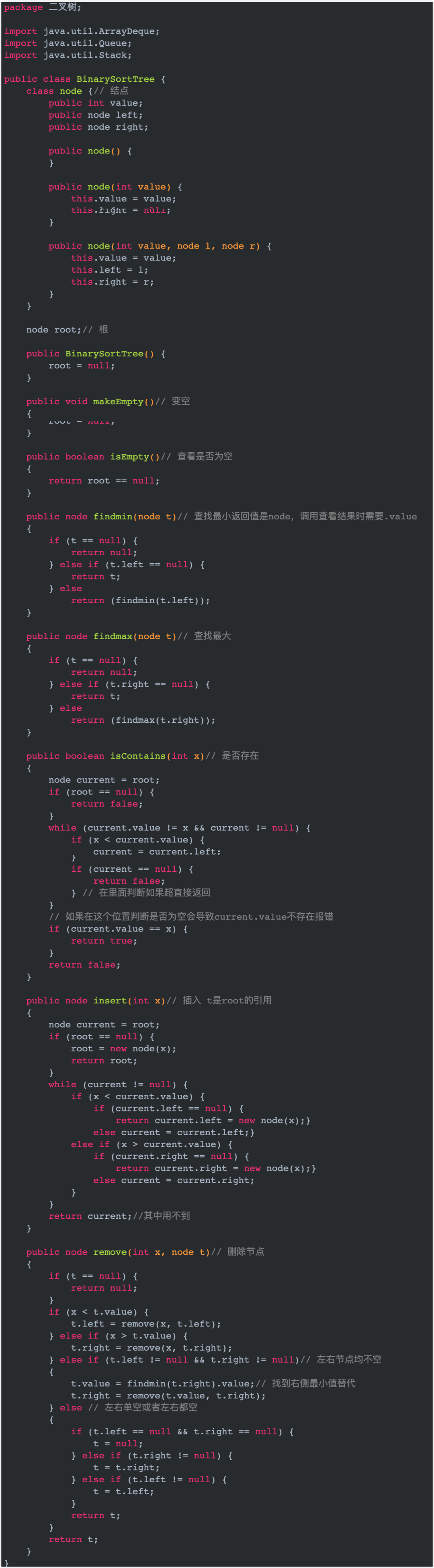 public class BinarySortTree {node root;//根public BinarySortTree(){root=null;}public void makeEmpty()//变空{root=null;}public boolean isEmpty()//查看是否为空{return root==null;}//各种方法