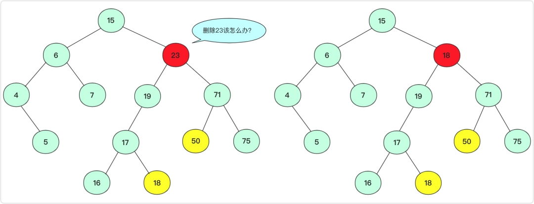 左右孩子节点都不为空这种情况是相对比较复杂的,因为不能直接用其中一个孩子节点替代当前节点(放不下,如果孩子节点也有两个孩子那么有一个节点无法放,例如拿下面71节点替代)这个图有点问题,应该是19节点不是18
