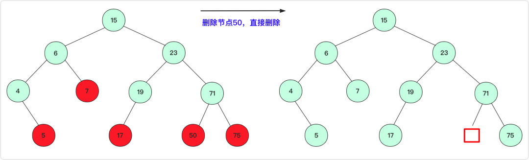 这种情况不需要考虑,直接删除即可(节点=null即可)(图中红色点均满足这种方式)。